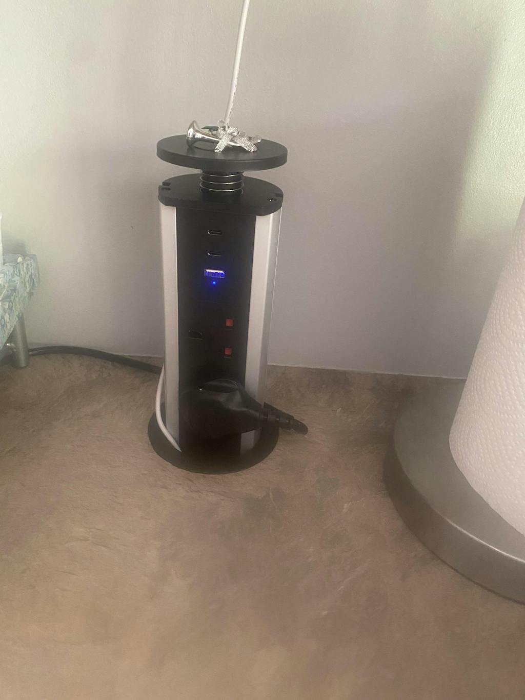 The V1 range is a compact and sturdy manual-lift retractable power socket device featuring USB charging and an 90mm (+/- 6mm) installation hole size.